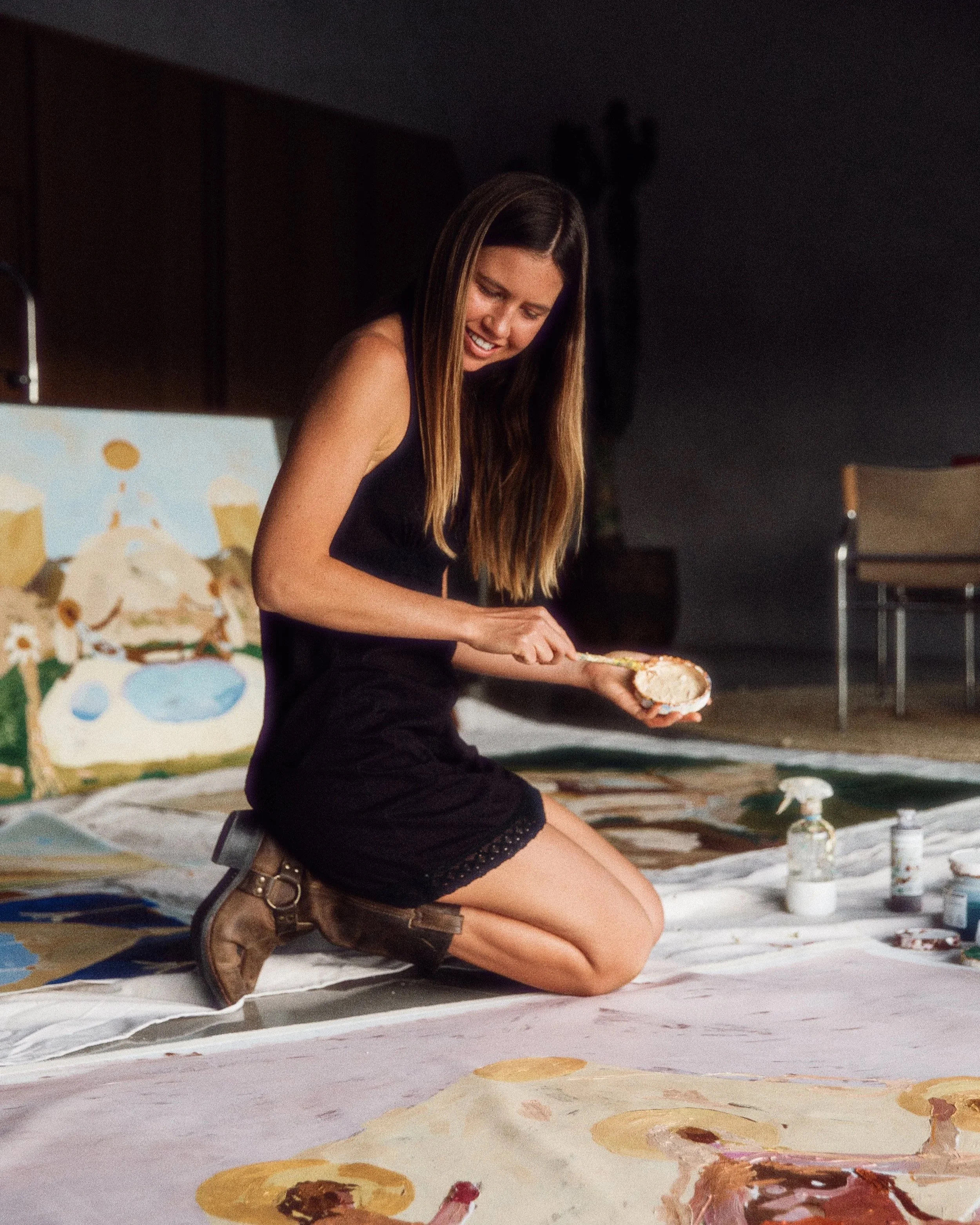 Her paintings are characterised by bold mark-making and an instinctive, whimsical use of colour. Guided by an ongoing engagement with the subconscious, her practice dances in the space between spontaneity and quiet consideration.